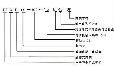 型號 電機功率 減速比 安裝方式 測速方式 處軸孔徑 安裝方向